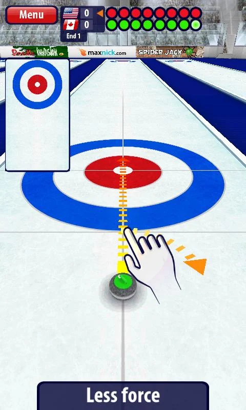 Curling3D attempts to simulate the excitement of the game by incorporating many aspects of the actual sport. Fundamentally, curling is about force, mass, friction, momentum, rotation and collision. The app exploits the sophisticated physics engine built into the Android OS to generate a convincing simulation of all these elements as they interact. In the terminology of curling, the weight is the velocity of the stone; the turn is the rotation of the stone (which affects its trajectory); and the line is the direction of the throw or delivery. Curling3D allows the player to continuously and independently control all three, permitting advanced tactics such as the guard, takeout, and tap. In addition, the app allows the player to sweep the ice while their stone is moving, adjusting trajectory after the delivery.